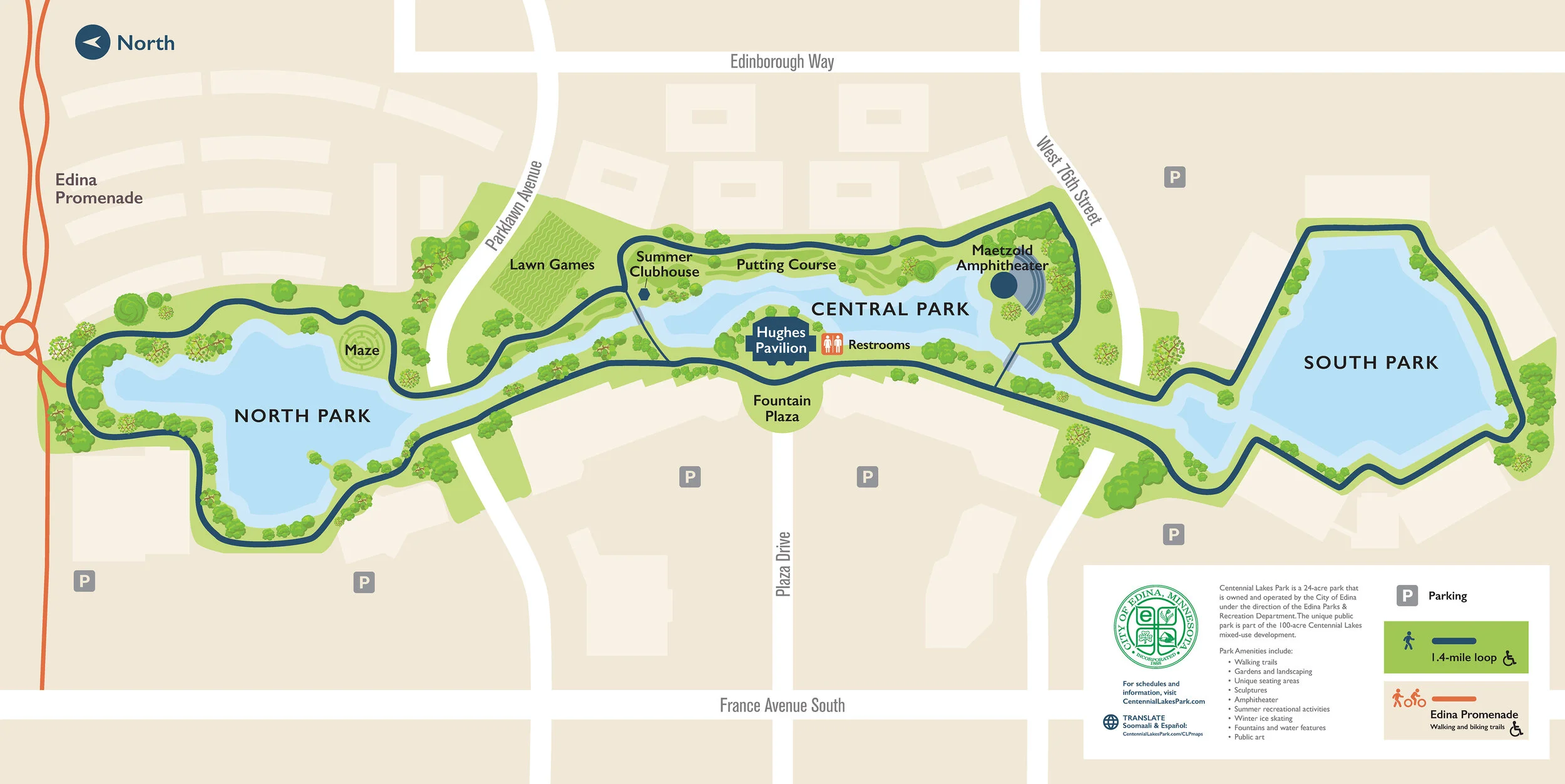 Centennial Lakes Park draws visitors from throughout the Twin Cities and beyond to skate in winter, play the putting courses or rent paddle boats in summer or just walk its paths year-round for the scenic beauty. A well-designed map can help welcome visitors and connect them with the park brand, and allow them to easily find the information they're looking for. The new one I created in 2021 is on brand, easier to read, and includes translations to other languages.