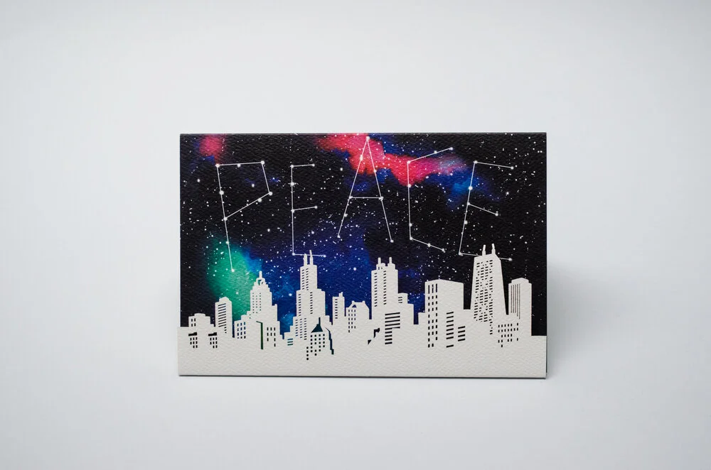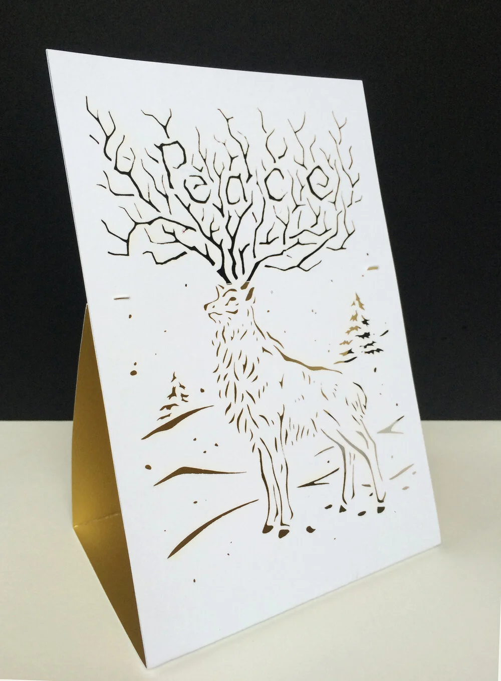 For several years I was the lead designer for these creative holiday cards for Equity Group Investments. The design is unique every year but always celebrates PEACE. The intricate laser die-cut cards are made to stand up on a desk. They feature an illustrated diagram of how to fold on the bottom.